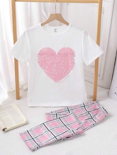 Tween Girls Classic Pink Plaid Pattern Casual Shirt And Pants 2 Pieces Home Outfit - Multicolor - View 1