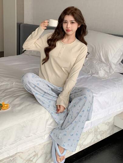 DAZY Knitted Top & Loose Ditsy Floral Pajama Pants 2 Pieces Sleep Set - Apricot - View 1