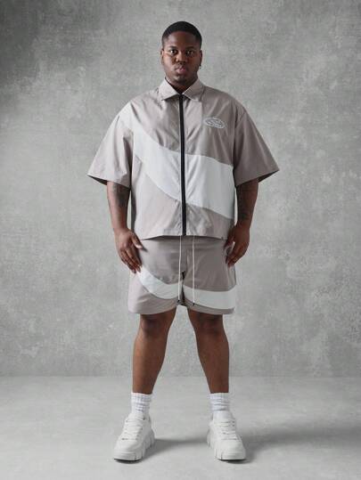 SUMWON Summer Athletic Plus Size Two Piece Set Zip Front Boxy Shirt Matching Shorts All Season Essential Track Suit Loungewear Casual Streetwear - Khaki - View 1