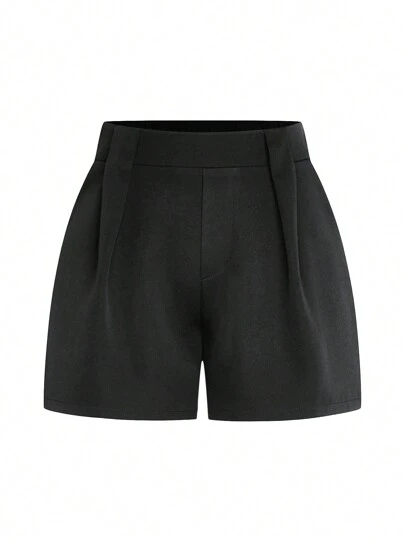 SHEIN LUNE Plus Size Women Solid Color Pleated Loose Casual Shorts - Black - View 1