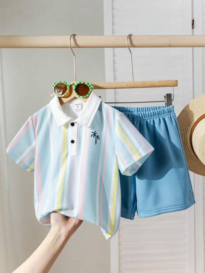 SHEIN Leap Crew 2pcs/Set Young Boys Casual Vacation Coconut Tree Striped Print Polo Shirt & Solid Blue Knit Shorts Set, Suitable For Kids Outfits, Young Boy Clothes, Back To School, Birthday Parties, Daily Wear, School, Travel, Sports, Spring/Summer Seasons - Multicolor - View 1