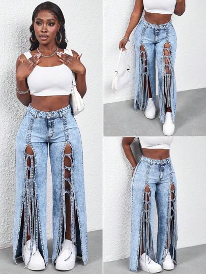 SHEIN Slayr Ladies' Fashion Tie-Waist Side Split Denim Long Pants - Blue - View 1