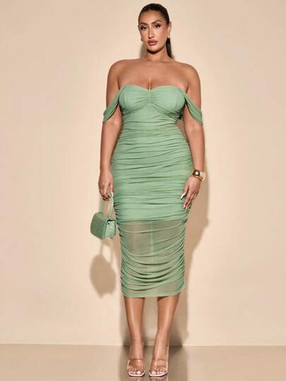SHEIN BAE Plus Size Women Off Shoulder Green Mid-Length Dress, Suitable For Casual, Outing, Date, Afternoon Tea, Vacation, Spring/Summer, Spring Outfits For Women, Summer/Summer Outfits For Women, Festival/Concert Outfit Women/Rave Outfits Festival/ Rave Outfits/, Spring Break Outfits, Graduation Dress, Graduation Dress, Mesh Dress - Green - View 1