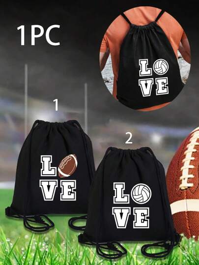 Black Drawstring Backpack Printed With The 'Love' And Ball Patterns Monogram,Storage Bag, Small Backpack, Convenient Backpack, Shopping Backpack, Drawstring Storage Bag, Student Backpack, Lightweight Large Capacity Backpack For Outdoor Activities - Black - View 1