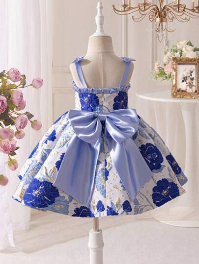 Young Girl Jacquard Woven Bowknot Decor Camisole Dress - Blue - View 1