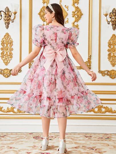 SHEIN Teen Girls' Elegant Floral Print Ruffled Puff Sleeve Dress - Pink - View 1