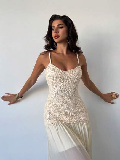 SHEIN Privé New Elegant Romantic Date Apricot Mesh Embroidered Contrast Mesh Slip Dress, Tight-Fitting Slimming Tall-Enhancing, Suitable For Spring/Summer, Valentine's Day Concert Rave Outfit Women,Graduation,Teacher Outfits For Women,Teacher Dress - Apricot - View 1