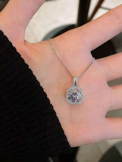 925 Sterling Silver Square Rhinestone Pendant Necklace For Women, Delicate Dainty Choker Necklace, Design, Versatile - Necklace - View 1