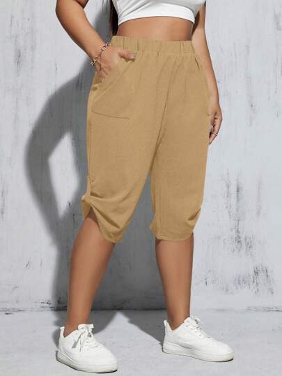 SHEIN Essnce Women's Plus Size Black Capri Pants With Bottom Buttons, Spring/Summer - Khaki - View 1