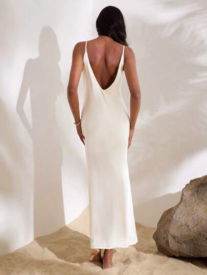 Opulessa 1pc Women's Solid Color Woven Backless Cami Maxi Dress Vacation Casual Spring - Apricot - View 3