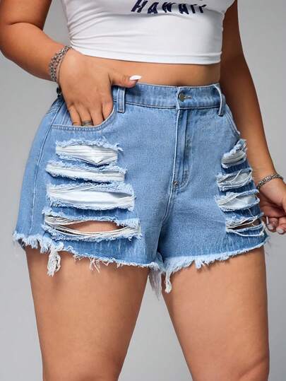 SHEIN EZwear Plus Size Women's Casual Denim Shorts, Fashionable & Suitable For Summer - Light Wash - View 1