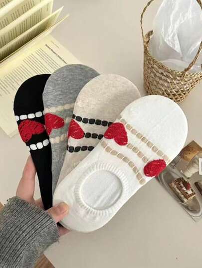 4 Pairs Random Heart Printed Crew Socks, Casual Stripes & Scribble Designs, Non-Slip Hidden Ankle Socks For Women, Spring/Summer, Fashionable & Versatile - Multicolor - View 1