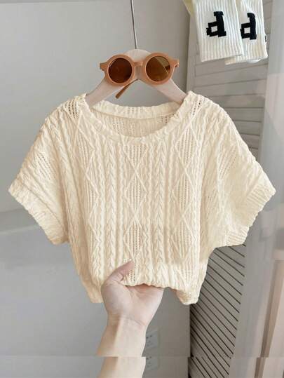SHEIN LMoss Kids LMoss Young Girl Solid Color Jacquard Knit Round Neck Fitted Cropped T-Shirt - Apricot - View 1