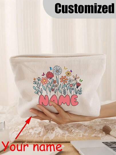 Customizable Makeup Bag - Polyester Makeup Bag With Secure Zipper And Personalized Name, Flower Pattern Makeup Bag, Lightweight Travel Makeup Bag, - Ideal Travel Accessory, Men And Women Beauty Storage Bag, Casual Style, Hand Washable, Party Gift For Close Friends And Sisters - Beige - View 1