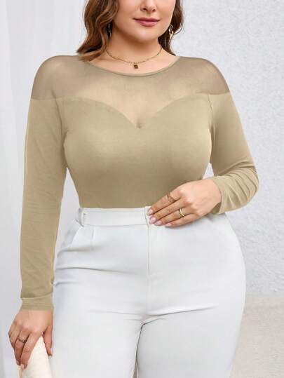 SHEIN Privé Plus Size Women Solid Round Neck Long Sleeve T-Shirt With Mesh Splicing - Apricot - View 1