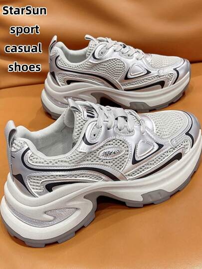 Women's Spring/Autumn New Casual Chunky Sneakers, Mesh Breathable Platform Wedge Heel Comfortable Lace-Up Lightweight Versatile Fashion Sneakers, White/Gray, Suitable For All Seasons - Grey - View 1