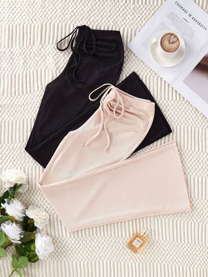 SHEIN 2pcs Women's Solid Color Front Drawstring Waist Soft Texture Rib Knit Lounge Pants - Multicolor - View 1