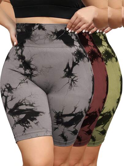 3pcs Plus Size Women Motorcycle Shorts - High Waist Tummy Control Tie-Dye Yoga Shorts - Multicolor - View 1