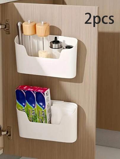 2pcs Convenient Wall-Mounted Storage Box For Kitchen, Bathroom, Office, Bedroom - Punch-Free Cabinet Door Organizer For Home Kitchen Supplies - White - View 1