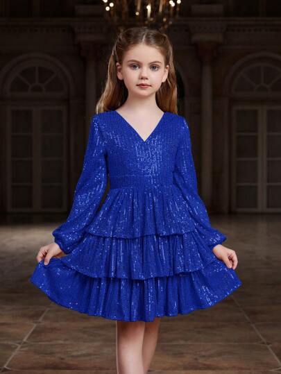ALISA&LEO Girls' Sequin V-Neck Lantern Sleeve Layered A-Line Sheer Formal Dress, Suitable For Red Carpet, Gala, Black Tie Wedding, Awards Ceremony, Charity Ball And Other Formal Occasions - Royal Blue - View 1