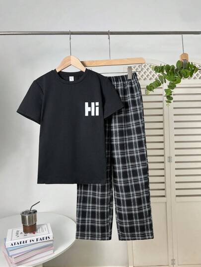 2pcs Tween Boy Letter Print Short Sleeve T-Shirt And Plaid Pattern Pants Casual Comfortable Pajama Set - Black - View 1
