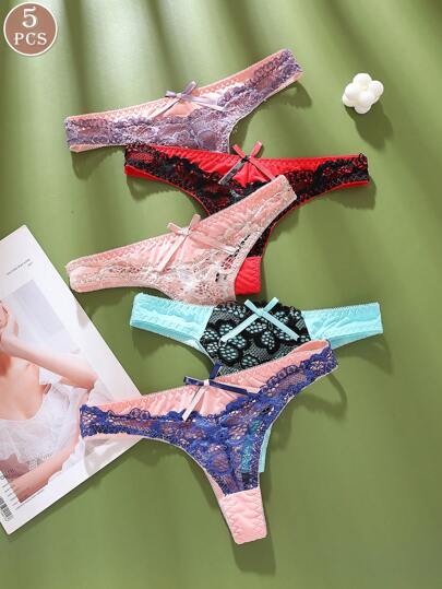 5pcs/Set Women Low Rise Lace Patchwork Panties, Comfortable Sexy Contrast Color Hollow Out Thong Briefs - Multicolor - View 1