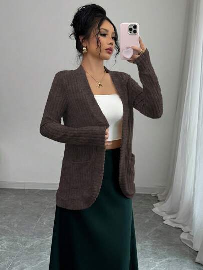 Elenzga Women's Casual Ribbed Knit Side Pockets Jacket, Outwear - Chocolate Brown - View 1