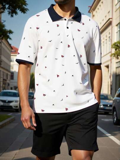 Manfinity Homme Plus Size Men's Full Print Contrast Collar Polo Shirt & Shorts Suit Set Men's Casual Daily Wear For Vacation And Commuting, Featuring A Classic Earthy Color Scheme With A Coffee, Khaki, And Brown Three-Color Gradient Patchwork On A Textured Short-Sleeve Casual Polo Made From Wheat Fiber Fabric With A Button Placket. This Polo Is Perfect For Hawaiian Beach Trips, Music Festivals, And Everyday Wear, Making It A Great Gift For Boyfriends Or Husbands. Men's Earth-Tone Textured Fabric Polo Shirt ,Polo Shirts For Men - Multicolor - View 6