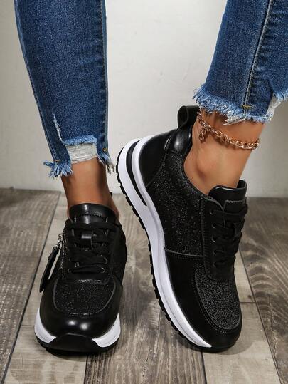 Women's Lace-Up Black Sequin Color Block Low Top Casual Sneakers, Women's Fashion Comfort Lightweight Minimalist Design Platform Shoes, Outdoor Versatile Skateboard Shoes, Thick Sole Elevator Shoes - Black - View 1