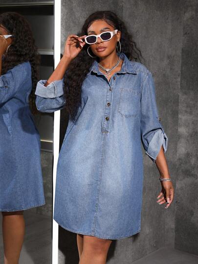 SHEIN Lady Plus Size Denim Long Sleeve Shirt Dress, Casual Blue - Light Wash - View 1