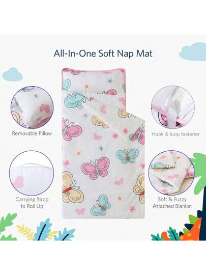 1pc Dinosaur Themed Toddler Nap Mat With Roll-Up Design, Detachable Pillow And Blanket, Machine Washable, Suitable For Daycare, Preschool, Travel And Camping - Pink - View 1