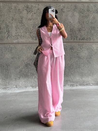 Coolane Kids Teen Girls Spring/Summer Striped Light Blue Fitted Sets,Two Pieces Outfits,Parent-Child Clothing - Pink - View 1
