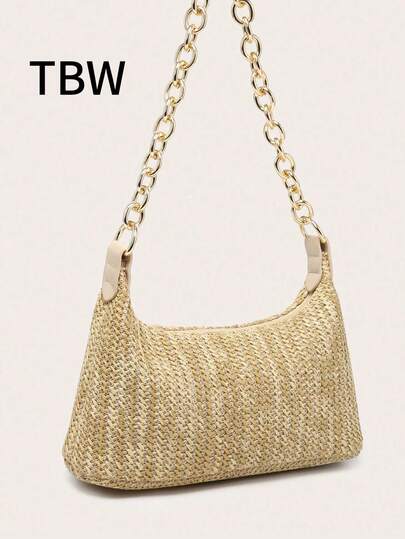 Women's Underarm Shoulder Bag, Square Metal Chain Bag, Large Capacity, Lightweight, Casual & Fashionable Beach Vacation Style, Suitable For Shopping And Vacation - Khaki - View 1