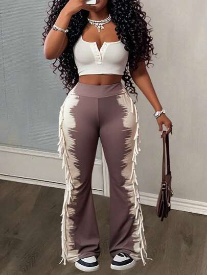 Slaydiva 2025 Summer New Arrivals, Music Festival, Western Style, Nomadic Style, Easter, St. Patrick's Day, Birthday Party, Graduation Season, Student Wear, Daily Casual, All-Match Versatile, Leisure, Vacation, Cruise Travel, Beach, Sunbathing, Fashionable, Streetwear, Ombre Print, Fringe, Flare Pants, Women Plus Size Long Pants - Brown - View 1