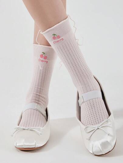 1 Pair Women's Summer Lightweight Breathable Mesh Openwork Plain Girl Sweet Ruffle Trim Embroidery Cherry Bow Heart Cutout Heel Split Ins College Style Student Socks, Mid-Calf Socks Casual Daily Wear - Multicolor - View 1