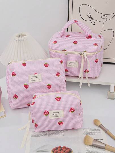 1 Piece Quilted Strawberry Design Travel Cosmetic Bag Multi-Functional Travel Cosmetic Bag Set Large Capacity Cosmetic Pouch,Makeup Bag Makeup Pouch Skincare Bag ,Large Capacity Zipper Bag For Travel ,Makeup Bag Makeup Pouch - Multicolor - View 1