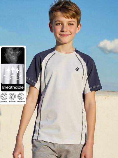 JNSQ Back To School Outdoor Sports Short Sleeve T-Shirt, Kids Round Neck Contrast Color Funny Letter Print Outdoor Sports Short Sleeve Tee - Multicolor - View 1