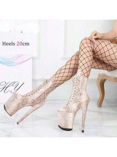20cm Two Tone Classic Serpentine Fine High Heels, Ultra High Waterproof Platform Strap Steel Tube Dance Shoes, Fashion Queen Short Boots,High Heels For Woman - Apricot - View 5