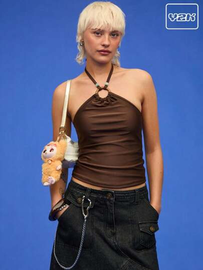 COUREZ Swim Halter Neck Top With Trim Details /Summer Outfits For Women Y2K Summer Tops Summer Clothes Casual Vintage - Brown - View 5