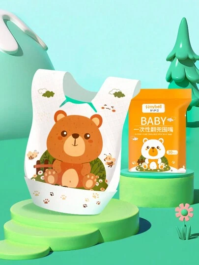 1 Pack Of 30 Cartoon Bear Print Non-woven Disposable Bibs With Independent Packaging For Infants, Avoid Making Clothes Dirty While Eating, Suitable For All Seasons - White - View 1