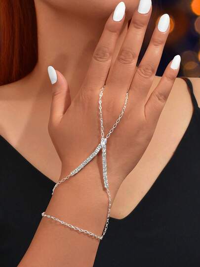 1pc Fashion Rhinestone Decor Silver Chain Bracelet With Ring, Jewelry For Women Party - Silver - View 1