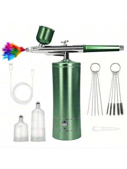 Spray Guns, Airbrush Kit With Compressor - 48PSI Rechargeable Cordless Non-Clogging High-Pressure Air Brush Set With 0.3mm Nozzle And Cleaning Brush Set For Nail Art, Painting, Cake Decor - Green - View 1
