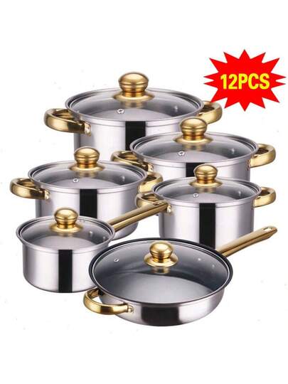 12Pcs Stainless Steel Induction Hob Casserole Pot Cookware Saucepan Dining Set - Silver - View 1