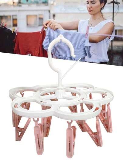 SHEIN 16 Clips Portable Socks Cloth Hanger Rack Clothespin Folding Multifunctional Wardrobe Storage Cloth Hangers Plastic Drying Racks - Pink - View 1
