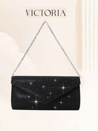 1PC Silver Mini Glitter Envelope Bag Sparkly Clutch Evening Bag With Chain For Women - Black - View 1
