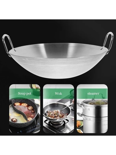 1PC Stainless Steel Wok With Deep Bottom Design, Stainless Steel Double-Handled Round Bottom Traditional Cooking Pot, Round Bottom Cooking Pot Made Of Stainless Steel, Suitable For Kitchens, Restaurants, And Homes - Silver - View 1
