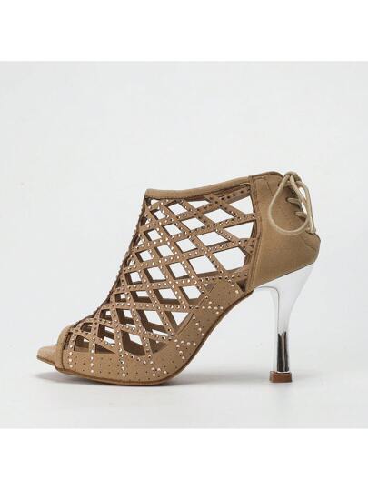 1pair Apricot Microfiber Rhinestone & Silver-Color Electroplating Salsa Latin Dance Shoes - Khaki - View 1