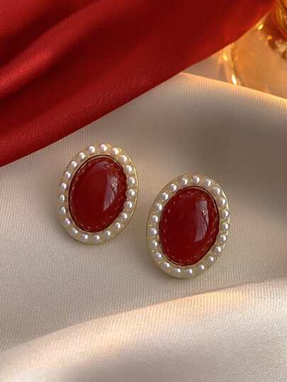 1pair Red Faux Pearl Stud Earrings - Red - View 1