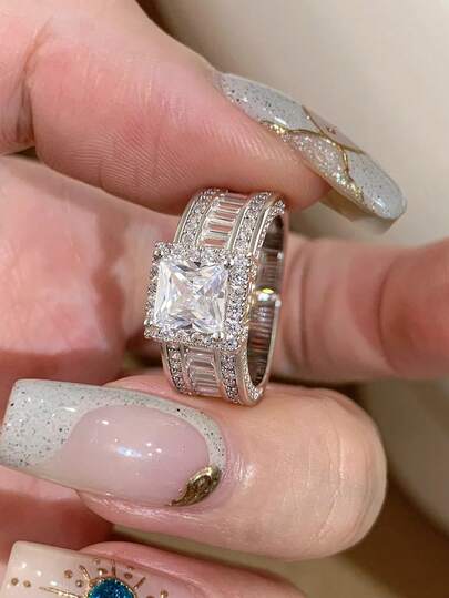 1pc 925 Sterling Silver Shiny Cubic Zirconia Square Ring, Basic Single Ring, Delicate Jewelry, Birthday/Party Gift For Her - Silver - View 1
