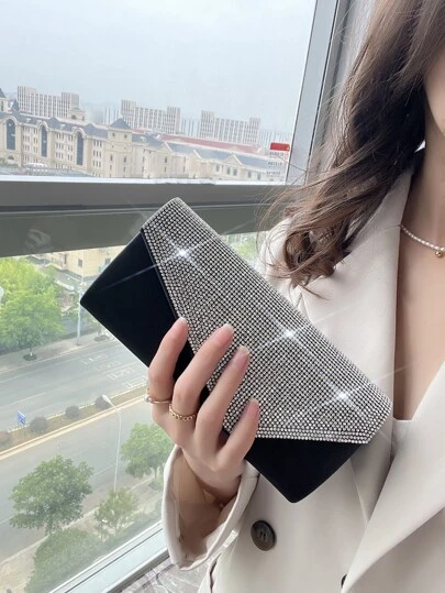 1pc High-Quality Satin Black Clutch Bag With Rhinestone Decor - Black - View 2